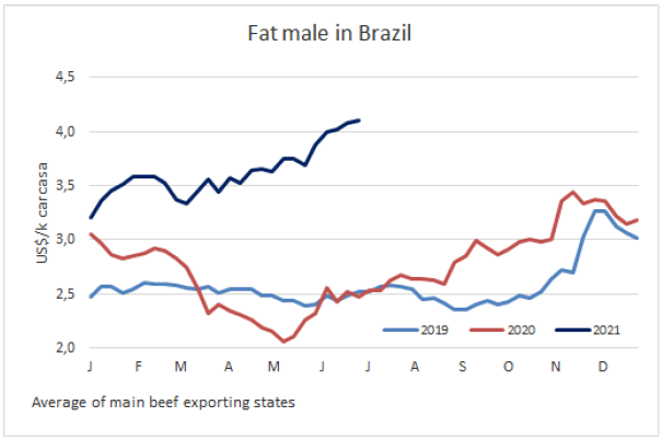 本周育肥牛市場保持堅(jiān)挺,價(jià)格變化不大。隨著活牛運(yùn)輸旺季到來,供應(yīng)仍然吃緊。然而需求端試圖減少采購來對(duì)抗這一情況,使價(jià)格不再繼續(xù)攀升。圣保羅州的平均價(jià)格與上周保持同一水平,銷售到國內(nèi)市場的育肥牛價(jià)格在310雷亞爾/15公斤,用于出口的育肥牛價(jià)格要高7雷亞爾。戈尼亞、米內(nèi)羅三角洲等地牛價(jià)有上漲,其他地區(qū)如大坎波、庫亞巴、隆多尼亞牛價(jià)有輕微上漲。批發(fā)市場周末的牛肉銷售不佳,但預(yù)計(jì)接下來幾天,受月初效應(yīng)影響牛肉銷售將有好轉(zhuǎn)。本周期貨市場育肥牛價(jià)格下跌,尤其是九月合同直至年末。這是由于巴西雷亞爾升值以及Guedes部長關(guān)于巴西貨幣有更多升值空間的預(yù)期,給出口商造成壓力,導(dǎo)致的出口平衡惡化。