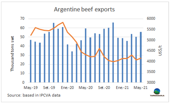 盡管政府在5月20日實(shí)行出口禁令,而且生產(chǎn)商暫停了9天的活牛銷售,5月的牛肉出口量是今年以來最高的,包括對(duì)中國的出口量。根據(jù)阿根廷牛肉促進(jìn)研究所(IPCVA)的一份報(bào)告,牛肉出口量達(dá)55742噸 (約7.8萬胴體重量當(dāng)量),出口額約2.315億美元(不包括內(nèi)臟)。也就是說,與4月相比,出口量和出口額分別增長了11%和13%,是2021年迄今為止最大。與去年相比,出口量同比下降了6.6%,由于國際市場價(jià)格下降,出口額下降了10%。與政策相反的出口表現(xiàn)主要原因是5月17日阿根廷總統(tǒng)宣布限制牛肉出口,該措施于5月20日開始生效,肉類工廠借此機(jī)會(huì)盡可能多的申請(qǐng)到所有的出口許可證,由于國際價(jià)格較好,在此之前已經(jīng)登記了大量的貨物。盡管農(nóng)業(yè)生產(chǎn)者發(fā)起了為期9天的罷工,肉類工廠和屠宰場仍在屠宰和加工已有的活牛。因此, 5月的屠宰量僅下降了11.7%。五月的平均出口離岸價(jià)約7400美元/噸,同比下降了3.7%,較4月增長了2%。