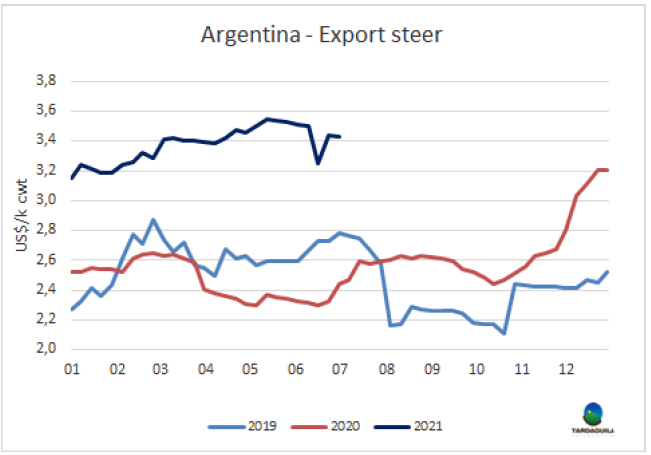 本周出口閹牛價(jià)格較上周大體保持不變。最好的英國純種閹牛參考價(jià)320-330比索/公斤。印度串種閹牛300-315比索/公斤。特優(yōu)母牛參考價(jià)255-260比索/公斤,發(fā)往中國市場的工業(yè)母牛價(jià)格在出口關(guān)停后大幅下跌,目前的參考價(jià)在195-215比索/公斤。
