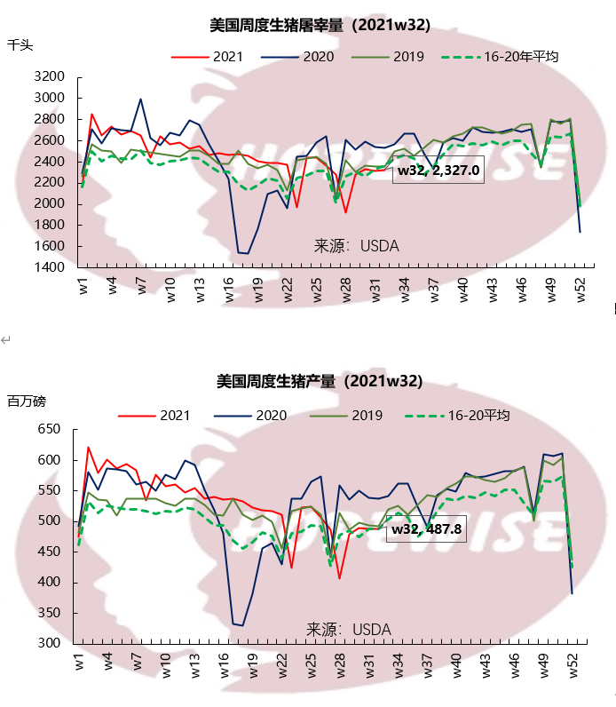 美國7月生豬均價109.10美金/百磅,環(huán)比下滑7.31%,同比上漲229.61%。豬胴體分割品綜合價119美金/百磅,環(huán)比下滑4.72%,同比上漲76.56%。由于屠企缺少工人,生豬價格下滑;而細(xì)分割品價格高企,助推豬胴體價格上漲。勞動力短缺成為生豬價格和豬胴體價格存在差異的主要因素。周均屠宰量222.58萬頭,環(huán)比減少3.5%,同比減少9.51%。養(yǎng)殖成本方面,玉米均價6.4美金/蒲式耳,環(huán)比下滑3.03%,同比上漲100%。大豆均價14.6美金/蒲式耳,環(huán)比下滑0.68%,同比上漲62.22%。