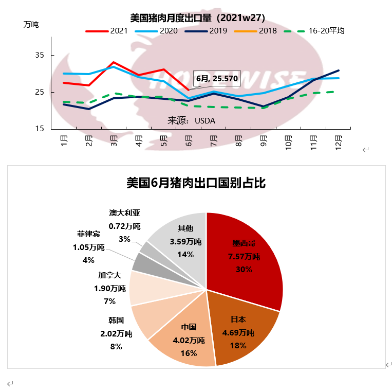 美國6月豬肉出口25.57萬噸,環(huán)比減少18%,同比增加9%。其中,出口墨西哥7.57萬噸,環(huán)比增加1%,同比增加52%,占6月美國豬肉出口總量的52%。出口中國4.02萬噸,環(huán)比減少45%,同比減少48%,占比16%。出口日本4.69萬噸,環(huán)比減少9%,同比增加38%,占比18%。強勁的墨西哥進(jìn)口需求不足以抵消中國進(jìn)口的下降。日本進(jìn)口量超過中國,躋身第二大美國豬肉出口目的國。出口韓國2.02萬噸,環(huán)比減少21%,同比增加31%,占比8%。