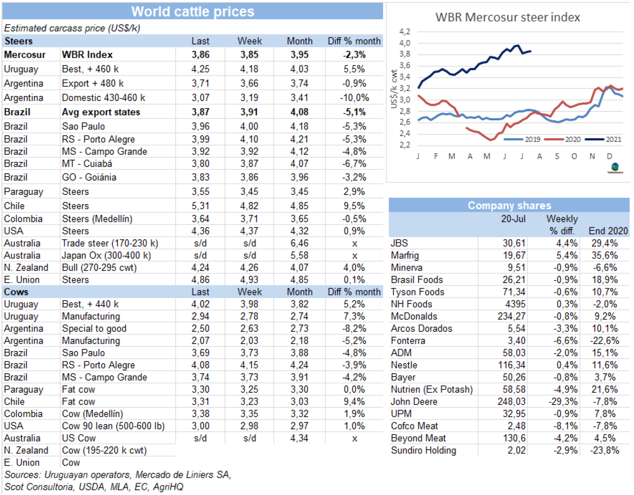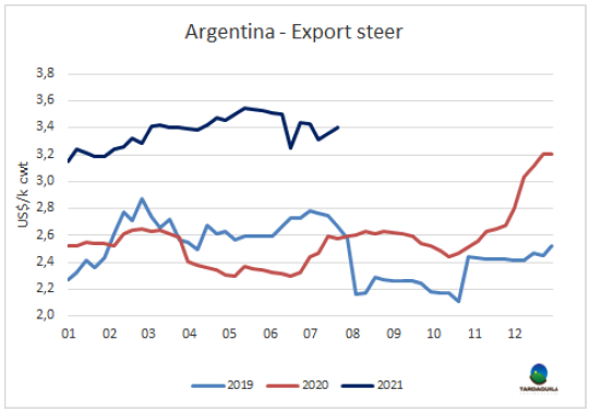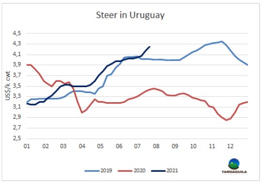 6月閹牛類型價值1261美元/頭,較上月增長了65美元,達2020年1月至今17個月以來的最高。烏拉圭肉協(xié)報告稱本月閹牛類型價值增加的原因是出口部位肉價格上漲和國內(nèi)市場胴體價格、副產(chǎn)品和鮮皮價格上漲。活牛采購價格上漲了37美元/頭,因此兩者的價差工業(yè)增加值增長了29美元至214美元,工業(yè)增加值增長了1.5%至17%,如果價值低于20%,則認(rèn)為該行業(yè)很難實現(xiàn)正利潤。