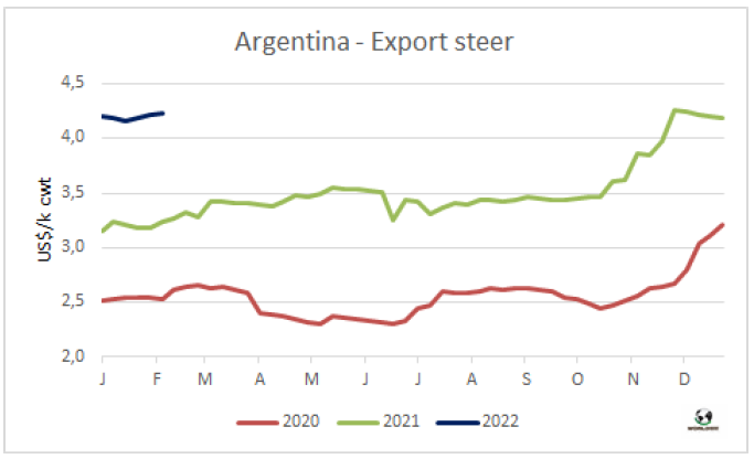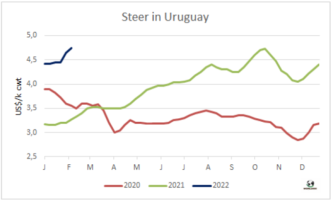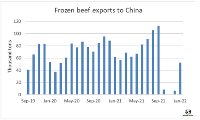 1月烏拉圭對(duì)中國(guó)的平均出口價(jià)格5931美元/噸,比12月的平均價(jià)格低43美元。烏拉圭對(duì)中國(guó)平均出口額連續(xù)11個(gè)月的增長(zhǎng)畫上句號(hào)。2022年1月的平均價(jià)格同比增長(zhǎng)了49%,這是由于不同部位肉價(jià)格的上漲,去骨部位肉相對(duì)于帶骨牛肉的占比更大。今年1月,烏拉圭對(duì)中國(guó)牛肉出口量占總出口量的76%,其中冷凍牛肉對(duì)中國(guó)出口量占總冷凍牛肉出口量的82%。根據(jù)海關(guān)出口數(shù)據(jù),1月烏拉圭牛肉出口量33167噸,平均價(jià)格為6455美元/噸。盡管出口量較去年12月的峰值下降了20%,但仍比2021年1月高27%。