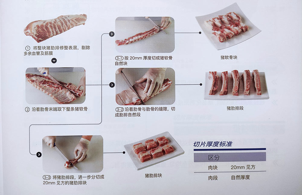 美國豬肉的谷飼飼養(yǎng)特性,基于菜式烹飪理念進行分割,才可體現(xiàn)其多汁濃郁、鮮美回甜的特性。由于整扇肋排每個區(qū)域的帶肉率有所不同,所以在分切時需做到盡量每一份的均衡,避免客訴。
