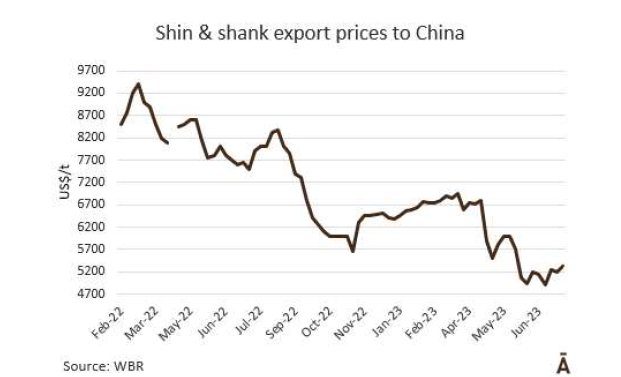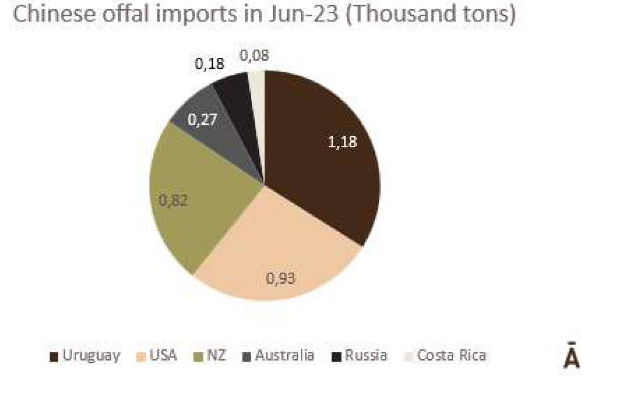 到目前為止,2023年,牛肉出貨量達(dá)到32.2萬(wàn)噸,比2022年同期增加了約2萬(wàn)噸(6.8%),主要原因是對(duì)中國(guó)銷(xiāo)售額的增加,中國(guó)的牛肉量占79.0%。以色列緊隨其后占5.6%,德國(guó)占3.6%;美國(guó)為2.9%,智利為2.7%。2022年7月至2023年6月,牛胴體重量出口累計(jì)91.7萬(wàn)噸,此外還有99.5萬(wàn)帶骨肉和牛骨,價(jià)值超過(guò)30.21億美元。牛內(nèi)臟出口量下降了20%至9800噸,價(jià)值近1400萬(wàn)美元 .