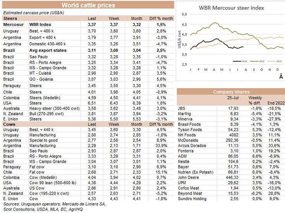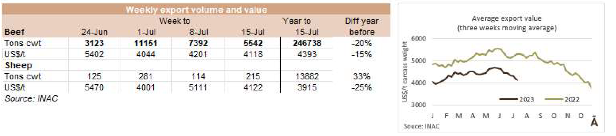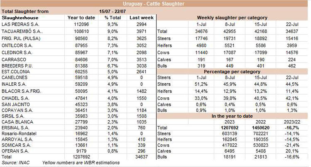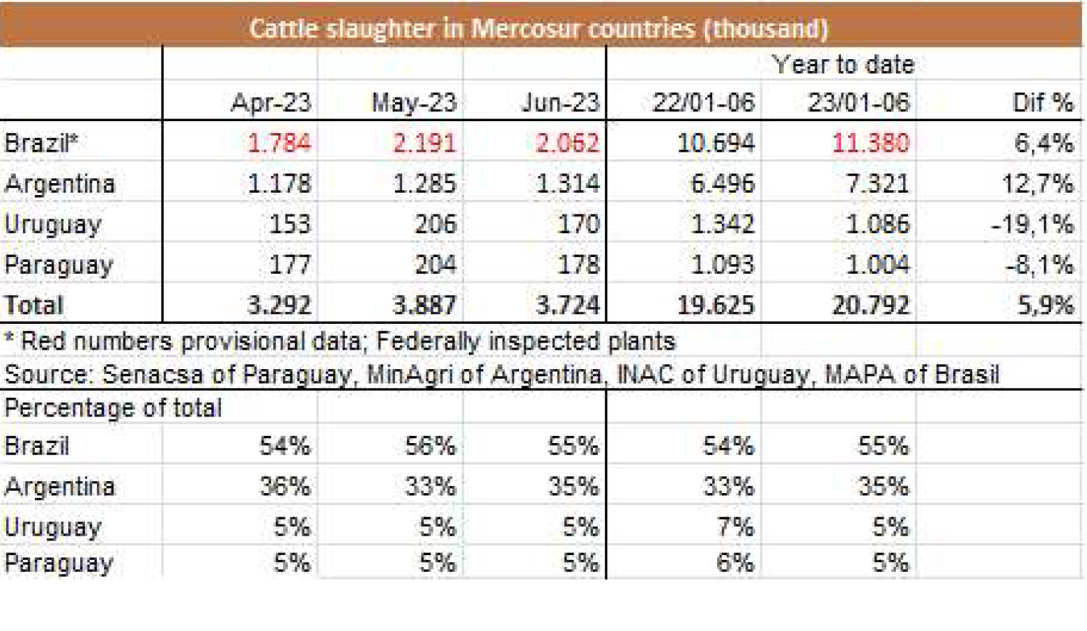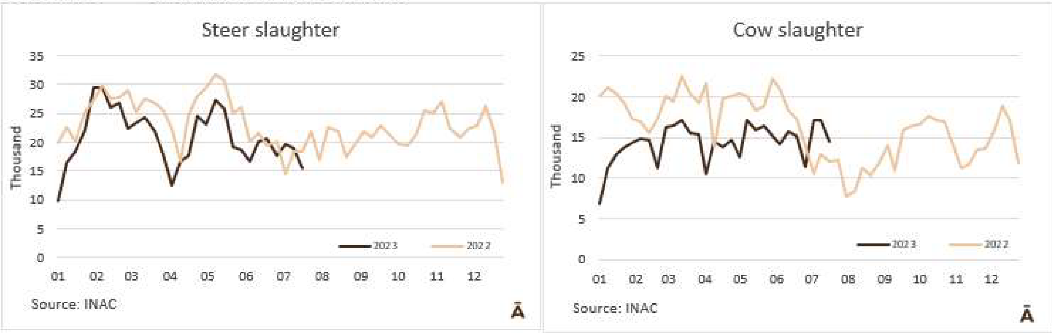 由于7月18日的非工作假期,上周的牛屠宰量下降約7500頭,與去年非常相似(-1%)。INAC報(bào)告稱,有34637頭牛進(jìn)入工廠。奶牛周減少量為15%(14576頭),是減少比例最小的。奶牛屠宰量占總量的42.1%,是今年迄今為止的最高比例。另外15416頭公牛(周減少量為-18%)和3959頭小母牛(周減少量是29%)被屠宰。屠宰量最大的公司是Marfrig-Takuaremb6(3971),Minerva、Pulsa(3625)和Carrasco(3513)。Marfrig在一周內(nèi)屠宰了8710頭牛,而Minerva和另外兩個(gè)工廠這周屠宰了7138頭牛。7月份的前22天,牛屠宰數(shù)量達(dá)到121942頭,比2022年同期高14.4%。這樣一來(lái),本月的屠宰量肯定會(huì)出現(xiàn)強(qiáng)勁的收縮趨勢(shì)。連續(xù)13個(gè)月下降后,與上年同月相比首次出現(xiàn)增長(zhǎng)。