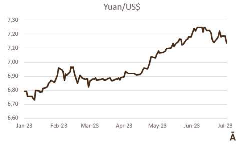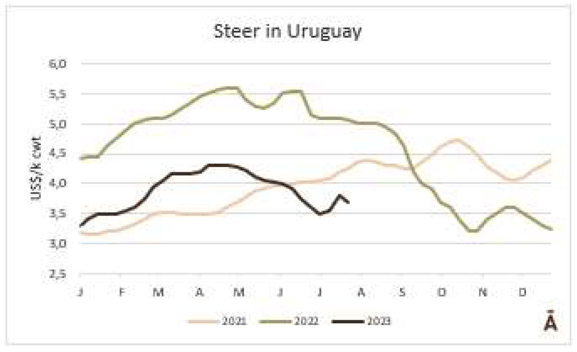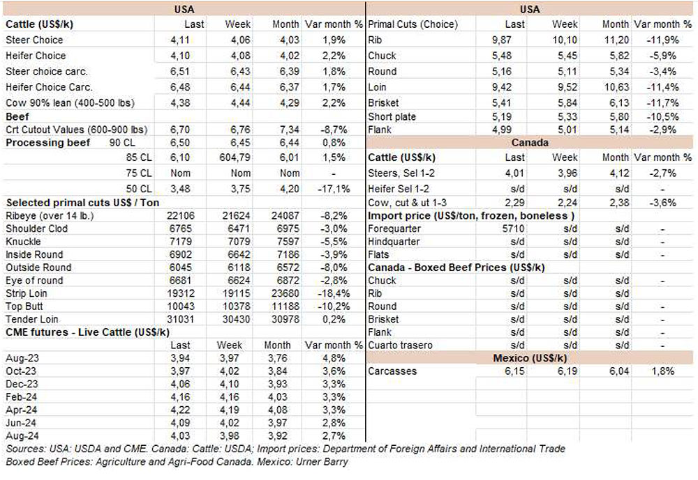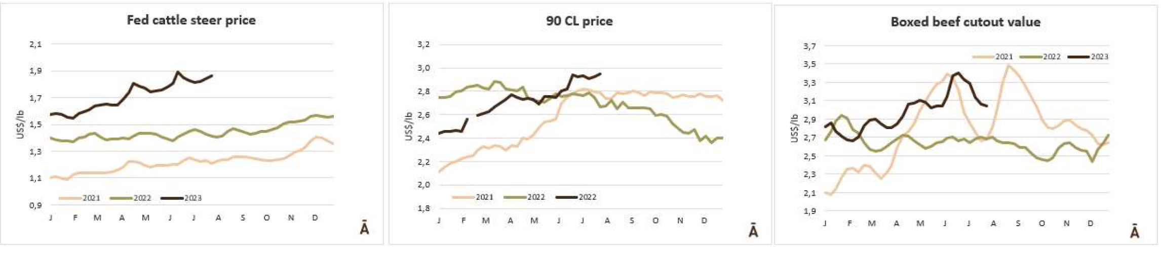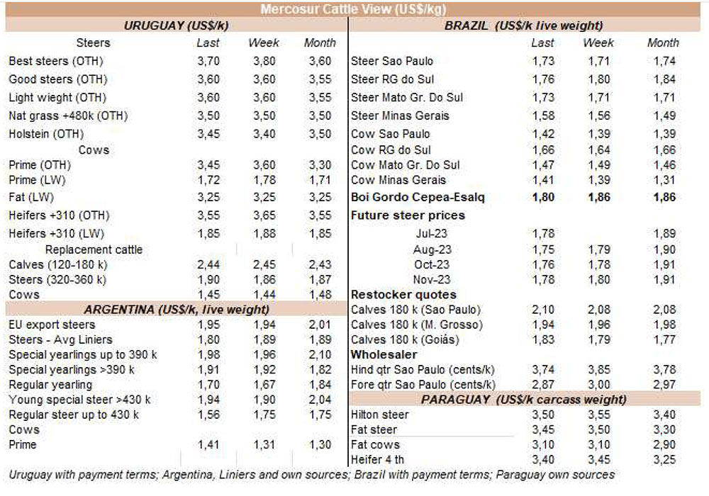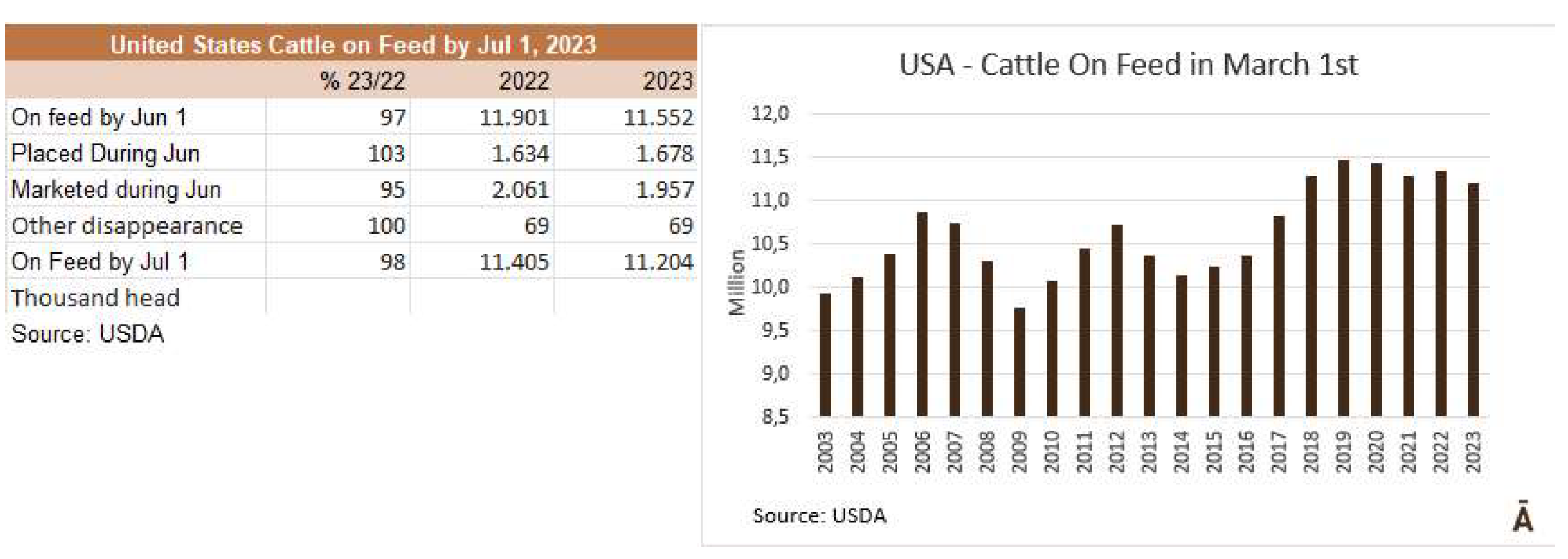 由于7月18日的非工作假期,上周的牛屠宰量下降約7500頭,與去年非常相似(-1%)。INAC報(bào)告稱,有34637頭牛進(jìn)入工廠。奶牛周減少量為15%(14576頭),是減少比例最小的。奶牛屠宰量占總量的42.1%,是今年迄今為止的最高比例。另外15416頭公牛(周減少量為-18%)和3959頭小母牛(周減少量是29%)被屠宰。屠宰量最大的公司是Marfrig-Takuaremb6(3971),Minerva、Pulsa(3625)和Carrasco(3513)。Marfrig在一周內(nèi)屠宰了8710頭牛,而Minerva和另外兩個(gè)工廠這周屠宰了7138頭牛。7月份的前22天,牛屠宰數(shù)量達(dá)到121942頭,比2022年同期高14.4%。這樣一來(lái),本月的屠宰量肯定會(huì)出現(xiàn)強(qiáng)勁的收縮趨勢(shì)。連續(xù)13個(gè)月下降后,與上年同月相比首次出現(xiàn)增長(zhǎng)。