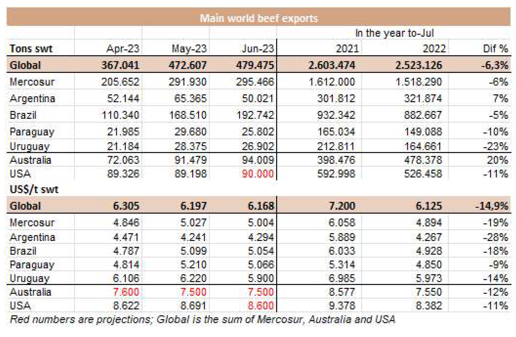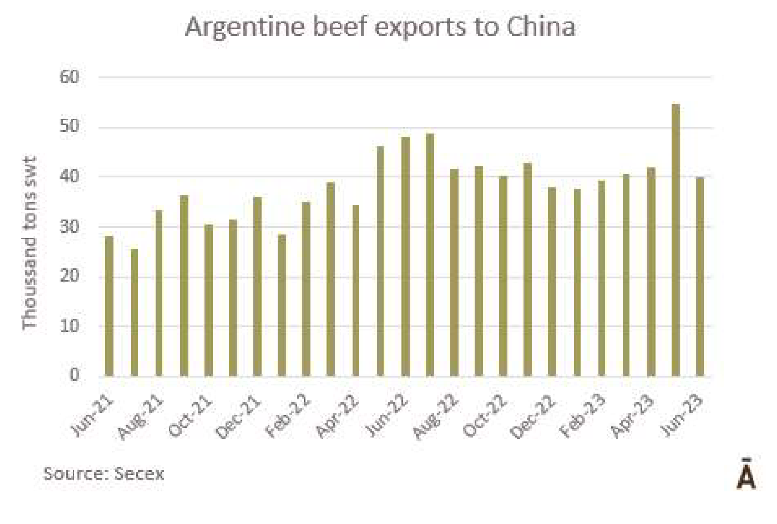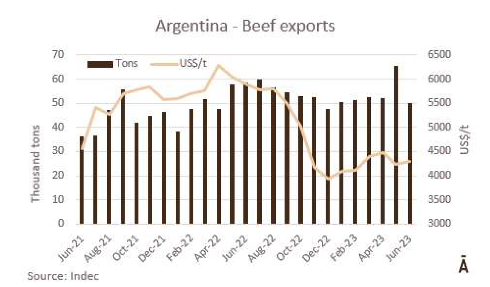 6月份冰鮮、冷凍和加工牛肉的出口總量略高于5萬(wàn)噸(4.1萬(wàn)噸肉和0.9萬(wàn)帶骨肉)。根據(jù)統(tǒng)計(jì),這是2023年迄今為止的最低月產(chǎn)量,比去年5月低24%,比6月低15%。SENASA衛(wèi)生服務(wù)部門(mén)的數(shù)據(jù)顯示六月份出口量比5月高,差異“主要是運(yùn)往中國(guó)的數(shù)量上,實(shí)際上比預(yù)計(jì)少1萬(wàn)噸?!?/span> 據(jù)美國(guó)廣播公司報(bào)道,“牛肉屠宰和生產(chǎn)一直處于高水平,6月份出口量的意外下降,主要是由于在支付國(guó)外運(yùn)費(fèi)方面出現(xiàn)了困難。就貨值而言,6月份的出口額接近2.15億美元,比上月降低22.5%,比去年的3.46億美元降低了38%。