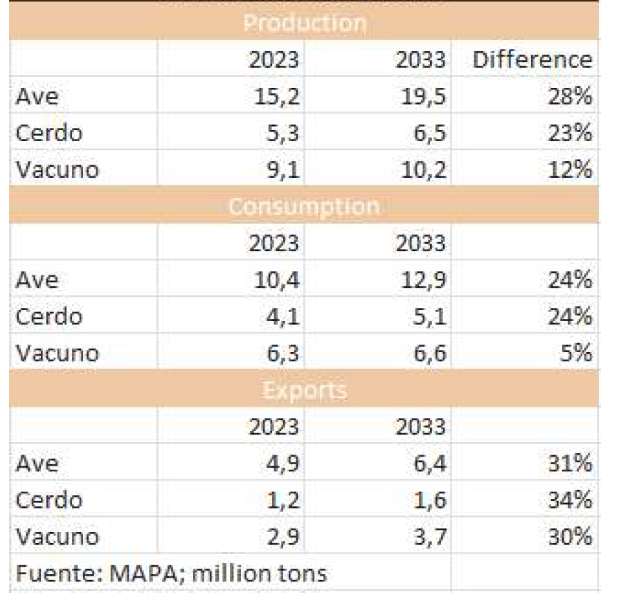 根據(jù)研究,未來(lái)十年,巴西的牛肉、豬肉和雞肉產(chǎn)量將增加660萬(wàn)噸,這意味著22.4%的顯著增長(zhǎng)。到2032/2033年,肉類年產(chǎn)量將從目前的2960萬(wàn)噸躍升至3620萬(wàn)噸。該研究強(qiáng)調(diào),雞肉和豬肉將引領(lǐng)經(jīng)濟(jì)增長(zhǎng),預(yù)計(jì)分別增長(zhǎng)28.1%和23.2%,牛肉產(chǎn)量將增長(zhǎng)12.4%。巴西將保持其在國(guó)際肉類市場(chǎng)的領(lǐng)導(dǎo)地位(全球供應(yīng)量28.5%)。該研究還強(qiáng)調(diào),國(guó)內(nèi)市場(chǎng)的增長(zhǎng)、出口和生產(chǎn)力的提高將是這一增長(zhǎng)的主要驅(qū)動(dòng)力。據(jù)Pecuaria報(bào)道,大約35.5%的雞肉生產(chǎn)將進(jìn)入國(guó)內(nèi)市場(chǎng),而豬肉將達(dá)到14.8%。