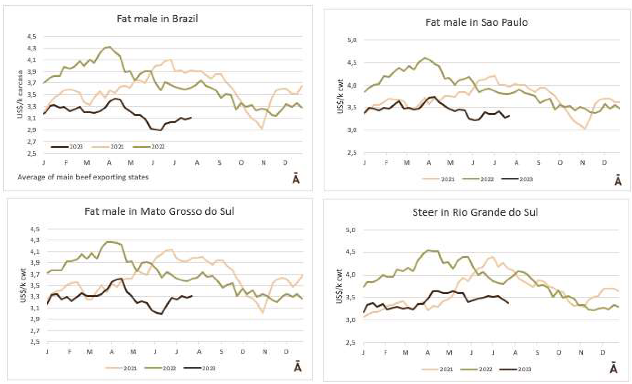 經(jīng)過(guò)前一周的下調(diào),本周巴西主要養(yǎng)牛區(qū)的屠宰牛價(jià)格保持穩(wěn)定。圣保羅州普通育肥牛平均價(jià)格是236.5雷亞爾/15公斤,出口中國(guó)市場(chǎng)30月齡以下的育肥牛價(jià)格高10雷亞爾/15公斤。巴西主要的牛市場(chǎng)價(jià)格與上周保持一致;批發(fā)市場(chǎng)的牛肉庫(kù)存給宰牛的價(jià)格造成了下行壓力。8月初,隨著父親節(jié)需求的增加,價(jià)格預(yù)計(jì)會(huì)上漲。