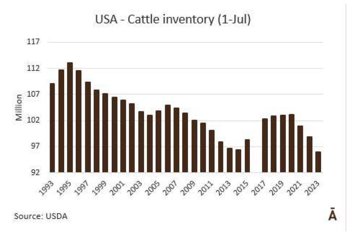 美國(guó)農(nóng)業(yè)部國(guó)家農(nóng)業(yè)統(tǒng)計(jì)局稱7月 1日牛庫(kù)存的數(shù)量是9590萬(wàn)頭,比去年的9860萬(wàn)頭低3%,是自1971年以來(lái)最小的庫(kù)存。所有奶牛和小母牛總計(jì)3880萬(wàn)頭,比2022年7月1日的3960萬(wàn)頭低2%。2940萬(wàn)頭的肉牛比一年前減少了3%。奶牛數(shù)量為940萬(wàn)頭,與前一年相比沒(méi)有變化。