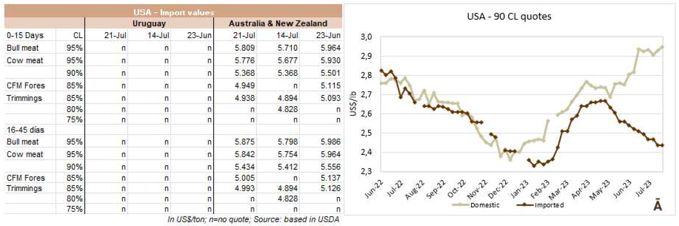 烏拉圭的美國(guó)進(jìn)口市場(chǎng)對(duì)牛肉砌塊保持著“良好的需求”,90CL的牛前非配額銷(xiāo)售價(jià)格是CFR4000美元,95CL是4200美元,85CL是3600美元。