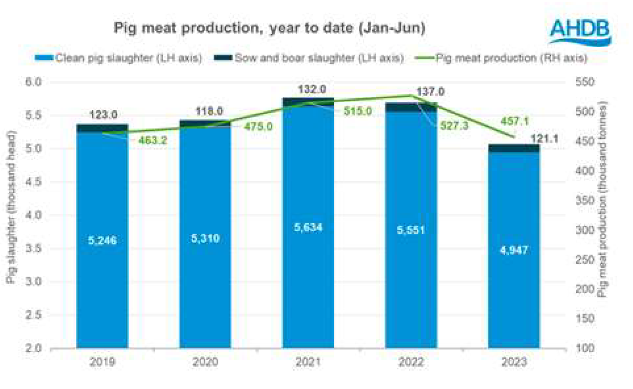 由于產(chǎn)量大幅下降,英國(guó)豬肉市場(chǎng)繼續(xù)保持非常緊張的供應(yīng)。這意味著生豬價(jià)格保持不變,但生豬屠宰場(chǎng)的屠宰量變少。6月份,豬肉產(chǎn)量達(dá)到74700噸。與2022年5月相比,產(chǎn)量下降了7%,與6月相比產(chǎn)量下降了11%。屠宰量達(dá)到813700頭,比5月份減少6%,比2022年減少11%。六月份胴體的重量也有所下降,為88.3公斤。今年迄今(1月至6月),英國(guó)豬肉總產(chǎn)量達(dá)到45.71萬(wàn)噸,比去年上半年的產(chǎn)量低13%,是2017年以來(lái)的最低產(chǎn)量。這主要是由于屠宰量較低,今年前六個(gè)月屠宰495萬(wàn)頭。這比去年下降了11%,也是自2013年以來(lái)的最低數(shù)字。