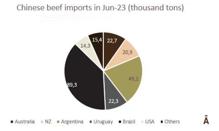 6月份,234065噸牛肉運(yùn)抵中國(guó),其中6288噸為冰鮮肉類,227777噸為冷凍牛肉。根據(jù)中國(guó)海關(guān)數(shù)據(jù),冰鮮牛肉的平均進(jìn)口價(jià)格為11063美元/噸,而冷凍牛肉的進(jìn)口價(jià)格達(dá)到5356美元/噸。南方共同市場(chǎng)國(guó)家占總量的69%,89345噸來(lái)自巴西,平均價(jià)格為5400美元/噸,49195噸來(lái)自阿根廷,價(jià)格為4485美元/噸,22135噸來(lái)自烏拉圭,價(jià)格為4197美元/噸。就冰鮮牛肉而言,52%來(lái)自澳大利亞,平均價(jià)格為10753美元/噸。