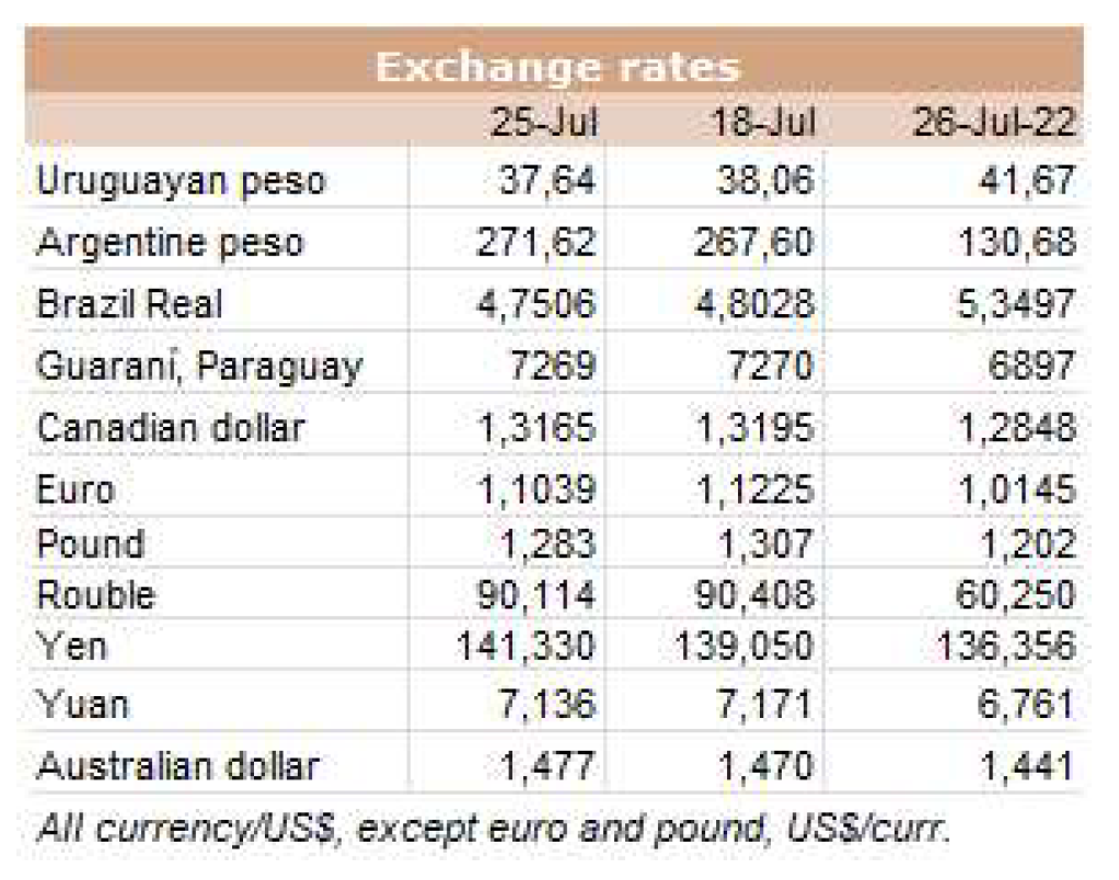 一位貿(mào)易商稱,智利進(jìn)口市場(chǎng)保持著控制“邊境開(kāi)放的情況下貨物的具體到貨量”的節(jié)奏。 他補(bǔ)充道,烏拉圭和巴西的19-20分體價(jià)格是CIF 5400-5600。消息人士評(píng)論道:“智利人正在等待市場(chǎng)吸收即將到來(lái)的東西,以便在國(guó)慶節(jié)期間外出購(gòu)買(mǎi),今年的國(guó)慶節(jié)會(huì)有點(diǎn)復(fù)雜。”。