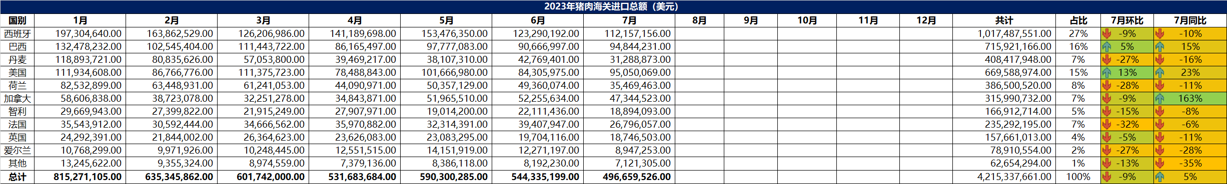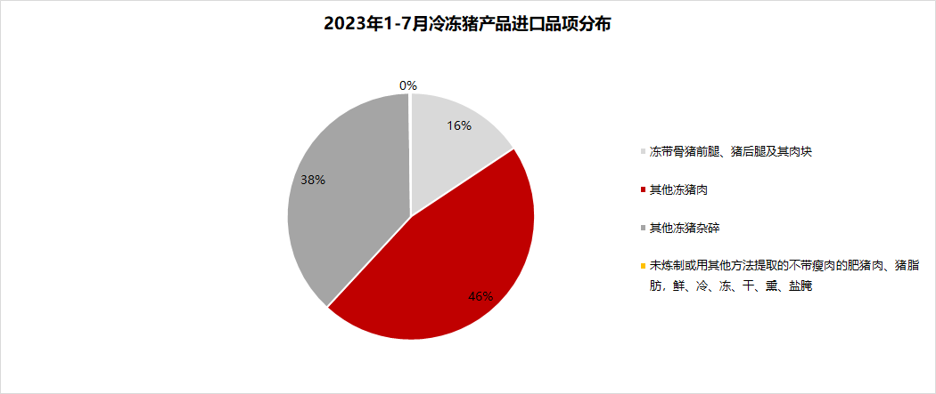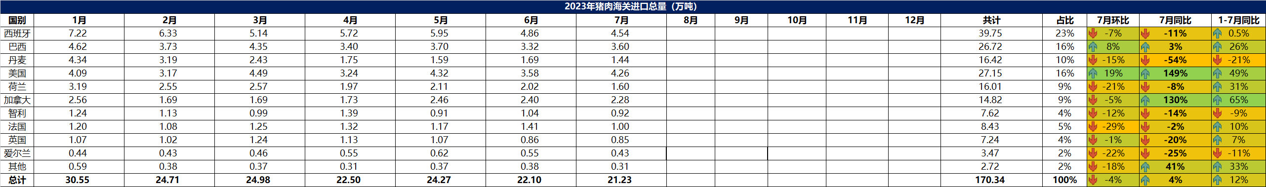 2023年7月中國主港豬肉進口量21.23萬噸,環(huán)比減少4%,同比增加4%。進口金額4.96億美元,環(huán)比下降9%,同比上漲5%。1-7月中國主港豬肉進口總量170.34萬噸,同比增加12%。進口總額42.15億美元,同比增長27.9%。從進口國別看,1-7月,從西班牙進口豬肉總量39.75萬噸,占進口總量的23%,同比減少11%。從美國進口豬肉27.15萬噸,占比16%,超過巴西成為中國主港豬肉進口第二大來源國,同比增加149%。從巴西進口豬肉26.72萬噸,占比16%,同比增加3%。從丹麥進口豬肉16.42萬噸,占比10%,同比減少54%。從荷蘭進口豬肉16.01萬噸,占比9%,同比減少8%。從加拿大進口豬肉14.82萬噸,占比9%,同比增長130%。中國主港進口豬肉區(qū)域分布發(fā)生明顯變化,從歐洲進口豬肉數量同比均有大幅減少,而從美國和加拿大進口豬肉數量同比增長驚人。從進口品項看,1-7月,進口其他凍豬肉78.73萬噸,占比46%。進口其他凍豬雜碎64.59萬噸,占比38%。主塊肉和油脂類進口量分別26.64萬噸和0.35萬噸,兩個品項進口量之和占比16%。