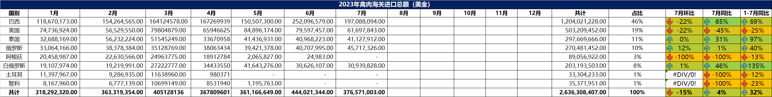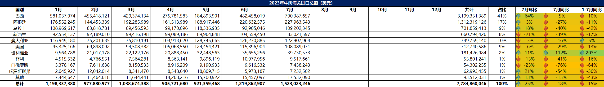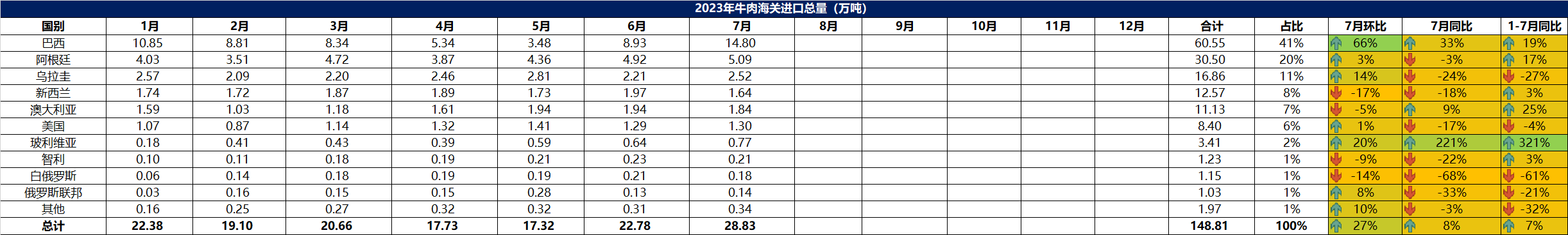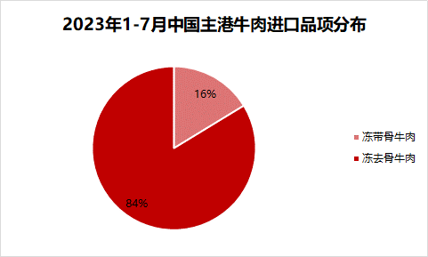 2023年7月中國主港牛肉進口量28.83萬噸,環(huán)比增長27%,同比增長8%。進口金額15.23億美元,環(huán)比增長25%,同比下滑18%。1-7月中國主港牛肉進口總量148.81萬噸,同比增長7%。進口總金額77.84億美元,同比下滑15%。從進口國別看,1-7月,從巴西進口牛肉數量60.55萬噸,同比增長19%,占進口總量的41%。從阿根廷進口牛肉數量30.50萬噸,同比增長17%,占比20%。從烏拉圭進口牛肉數量16.86萬噸,同比減少27%,占比11%。從新西蘭進口牛肉數量12.57萬噸,同比增長3%,占比8%。從澳洲進口牛肉數量11.13萬噸,同比增長25%,占比7%。玻利維亞牛肉自去年4月暫停牛肉出口,于去年11月恢復牛肉出口,因此今年1-7月從玻利維亞進口牛肉同比增長321%。從進口品項看,1-7月,中國主港進口凍帶骨牛肉24.23萬噸,進口凍去骨牛肉124.57萬噸。