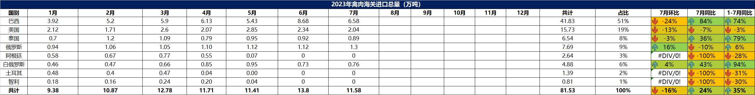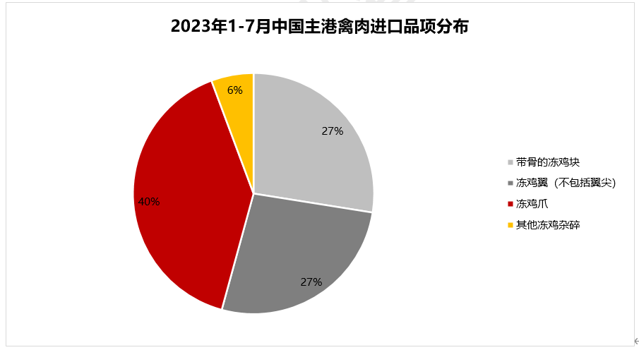 2023年7月中國主港進口禽肉數量11.58萬噸,環(huán)比減少16%,同比增長24%。進口金額3.76億美元,環(huán)比下滑15%,同比上漲4%。1-7月,中國主港進口禽肉共計81.53萬噸,同比增長35%。進口總額26.36億美元,同比增長32%。從進口國別看,1-7月,從巴西進口禽肉41.83萬噸,同比增長74%,占比51%。從美國進口禽肉15.73萬噸,同比減少3%,占比19%。從俄羅斯進口禽肉7.69萬噸,同比增長6%,占比9%。從泰國進口禽肉6.54萬噸,同比增長79%,占比8%。從進口品項看,凍雞爪進口總量32.67萬噸,占比40%。帶骨的凍雞塊進口總量22.454萬噸,占比27%。凍雞翼(不包括翼尖)進口總量21.80萬噸,占比27%。其他凍雞雜碎進口總量4.64萬噸,占比6%。